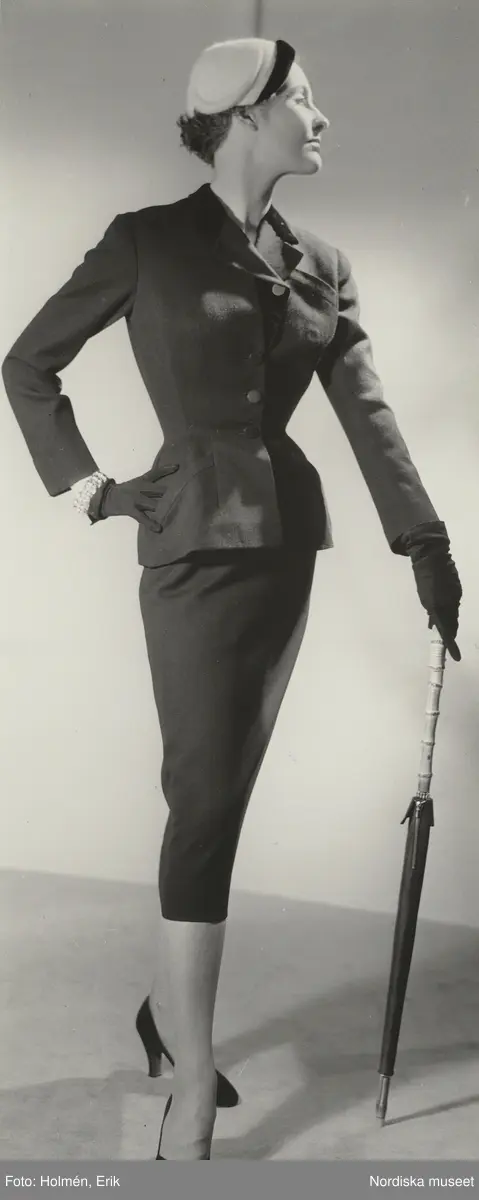 Modell i dräkt, handskar, hatt och pumps med paraply i handen. Från Balmain.