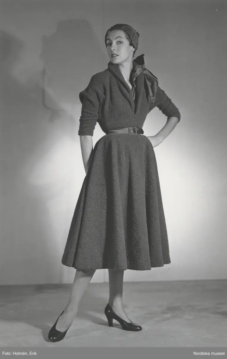 Modell i klänning med skärp och rosett på axeln, hatt och pumps. NK efter M. Grès.