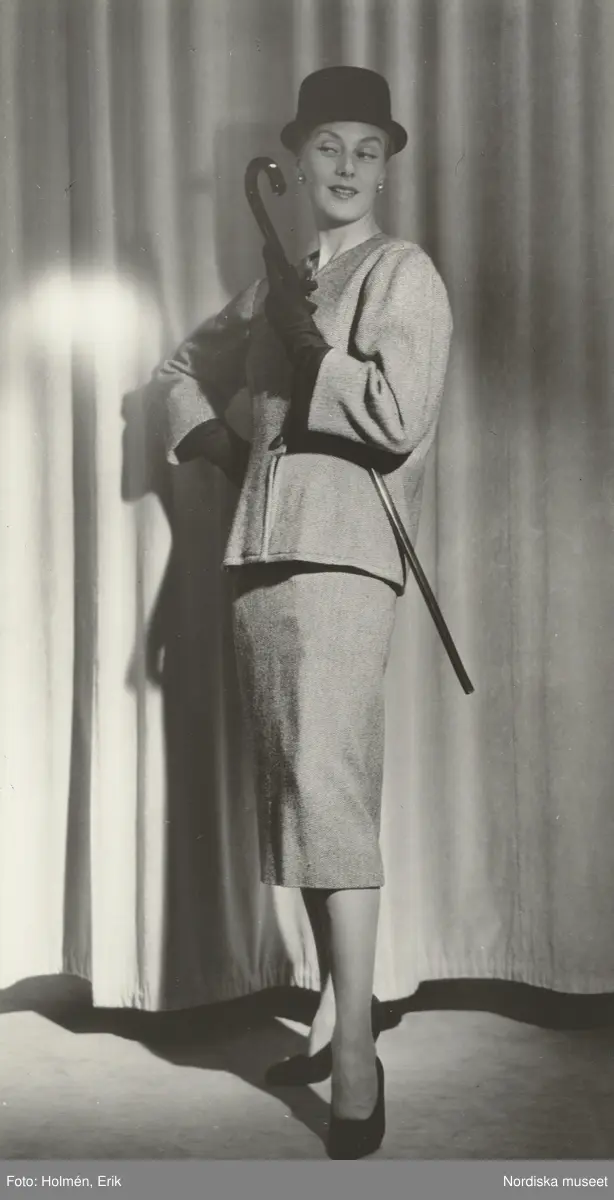 Modell i dräkt, hög hatt, örhängen, handskar och pumps med käpp i handen. Från Balenciaga.