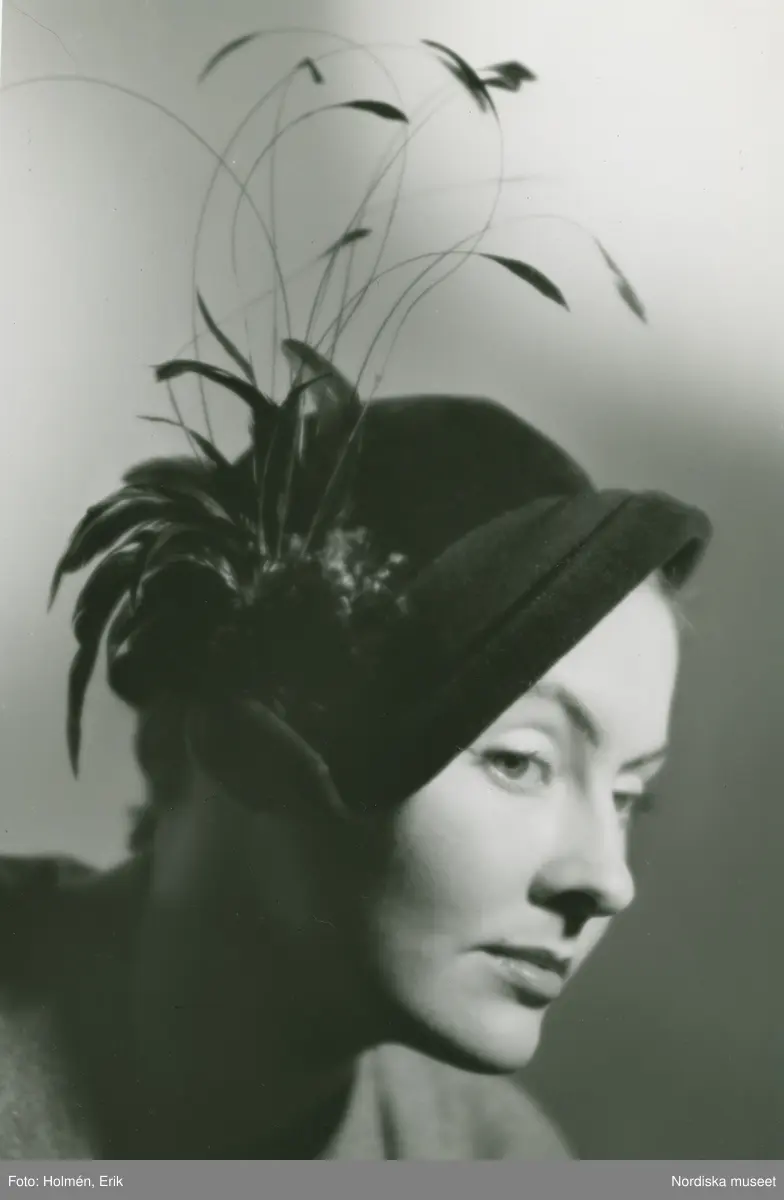 Porträtt av kvinna i svart velourhatt med fantasi, av Gilbert Orcel.