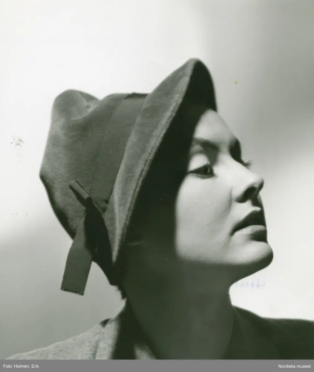 Porträtt av kvinna i natriabrun velourhatt, monterad med grönt band, av Rose Valais.