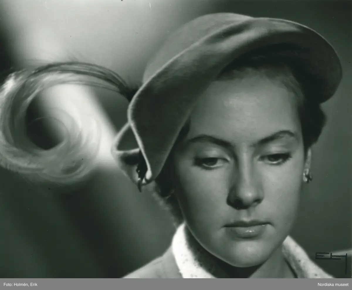 Porträtt av kvinna i senapsgul velourhatt med paradisfantasie i samma färg. Modell från Maison Claude St. Cyr.