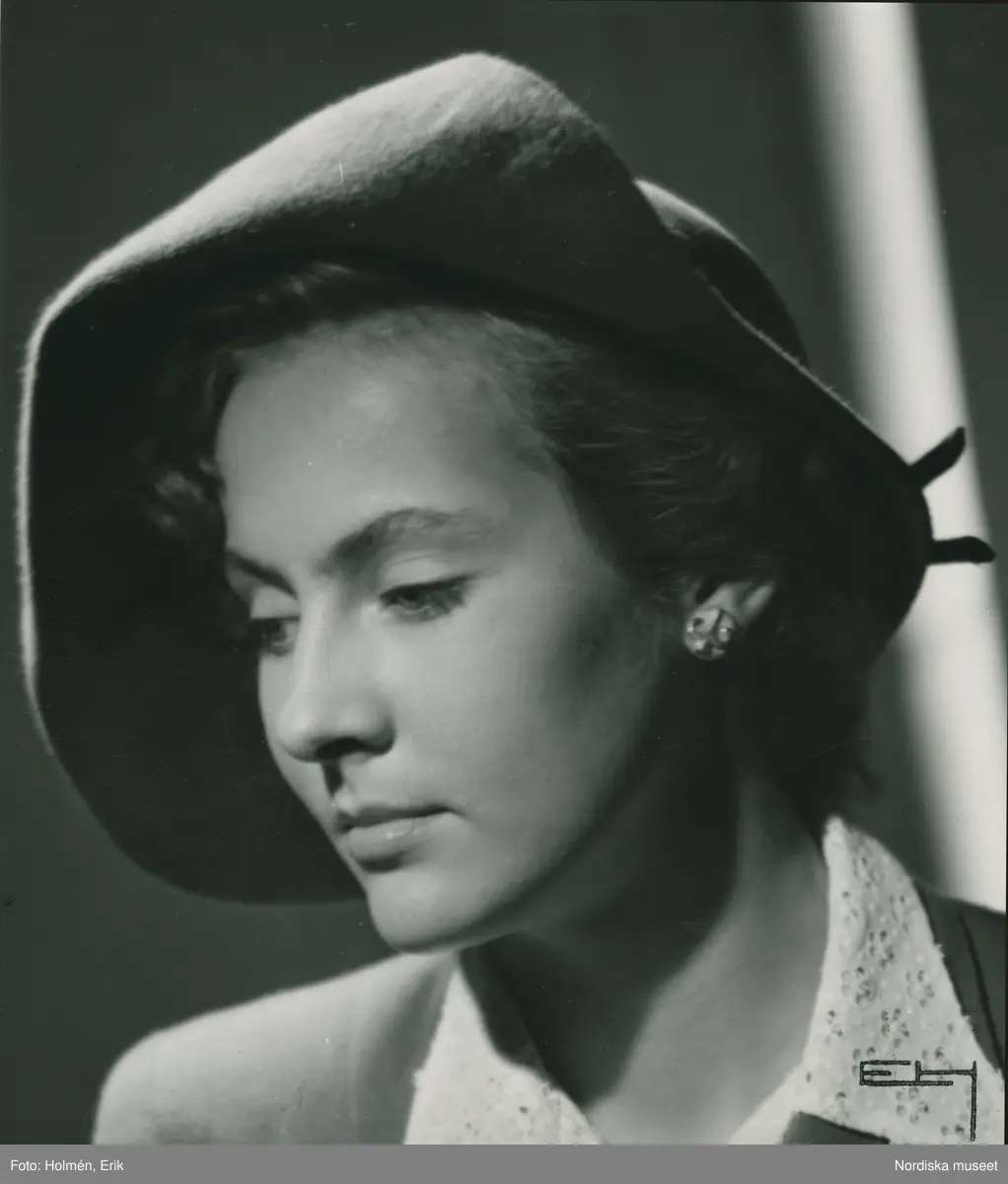 Porträtt av kvinna i grå enkel uppslagen filthatt. Modell från Jacques Fath.