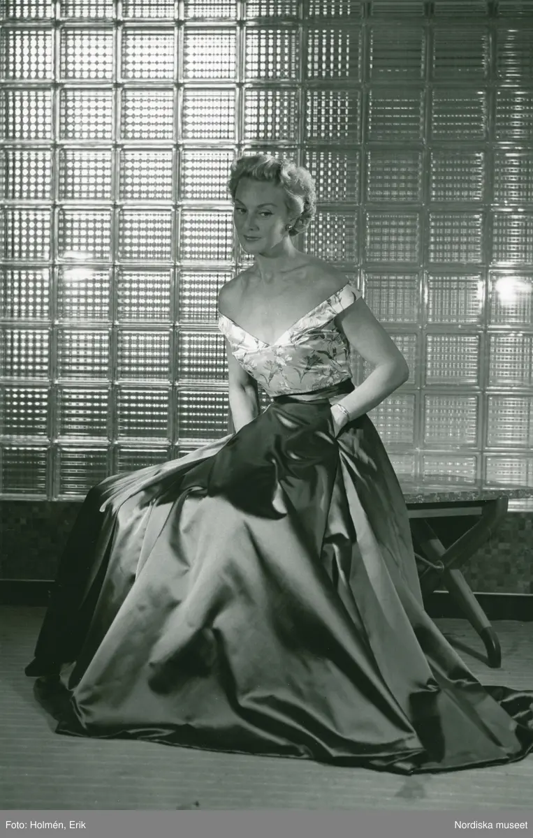 EM. Nordiska Kompaniet, Damkonfektion. Modell i aftonklädsel, ljus överdel och mörk underdel i siden. Sitter framför vägg i betongglas.