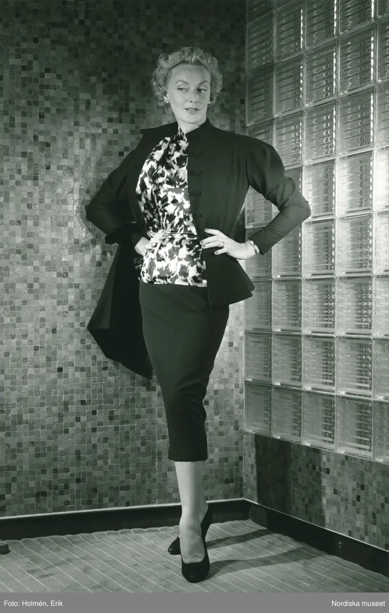EM. Nordiska Kompaniet, Damkonfektion. Modell i mönstrad blus, kjol, kavaj och pumps, står framför vägg i betongglas.