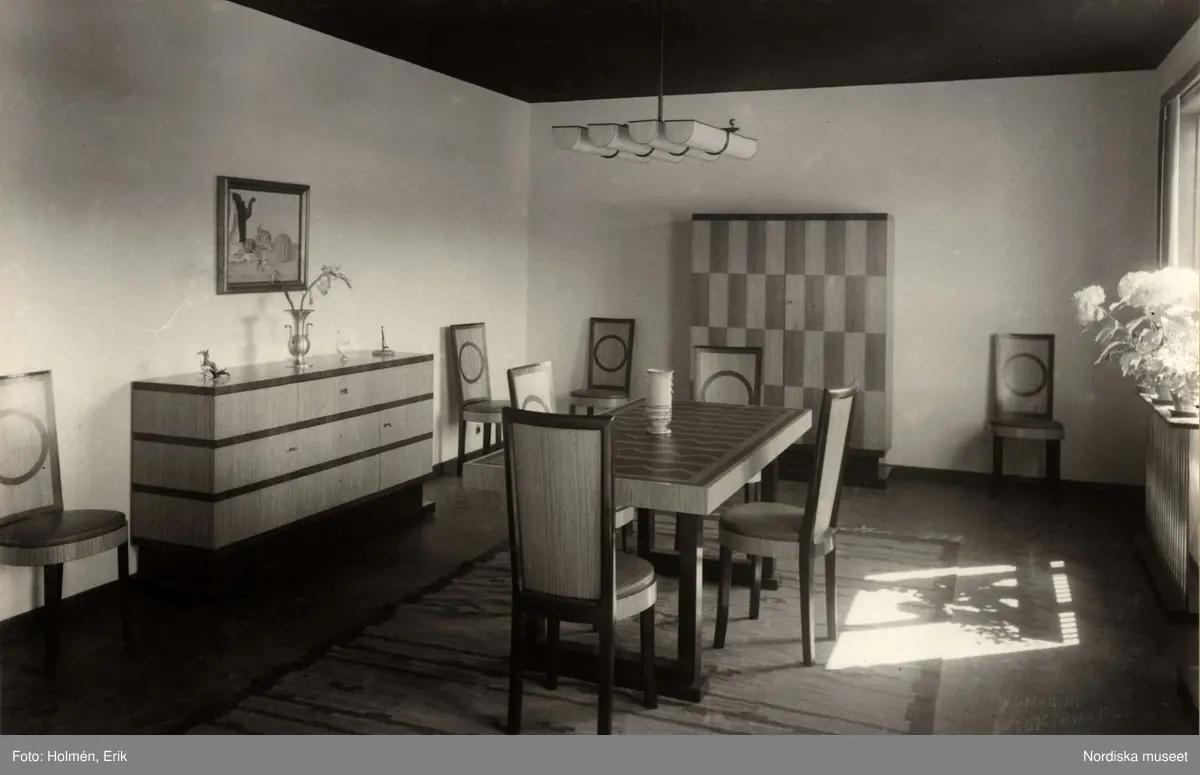 Stockholmsutställningen 1930. Matsal. "Möblerna äro gjorda av citronträ, valnöt och palissander samt björk. Bordskivan belagd med bordslinoleum, Golv och tak svarta. Väggarna benvita och stolarna klädda med skinn." Arkitekt A. E. Hjorth.