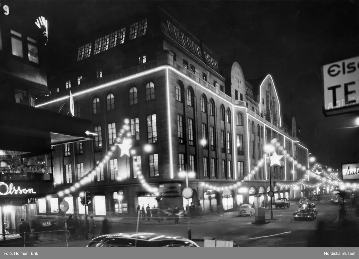 Titel: Hamngatan, Stockholm. Nordiska kompaniet i kvällsbelysning.