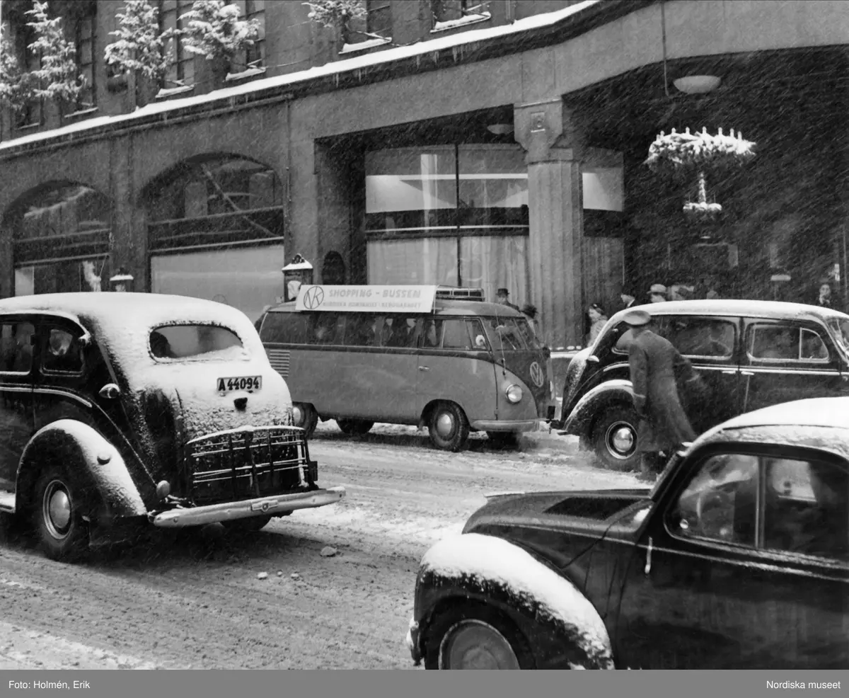 Nordiska kompaniets shoppingbuss på Hamngatan utanför varuhusets entré.