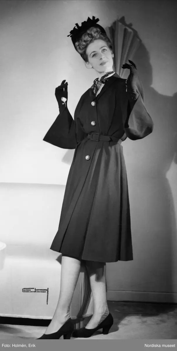 Mannekäng poserar i en kappa med skärp. Nordiska Kompaniet.