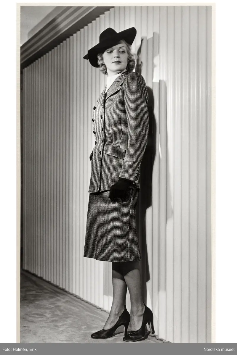 Mannekängen Margit Langlet visar ytterplagg i provrum. Dräkt med figursydd stusslång jacka, dubbelknäppt med nedsydda veck och ficklock. Knälång kjol. Hatt, handskar och pumps med hög klack. NK:s Franska damskrädderi.