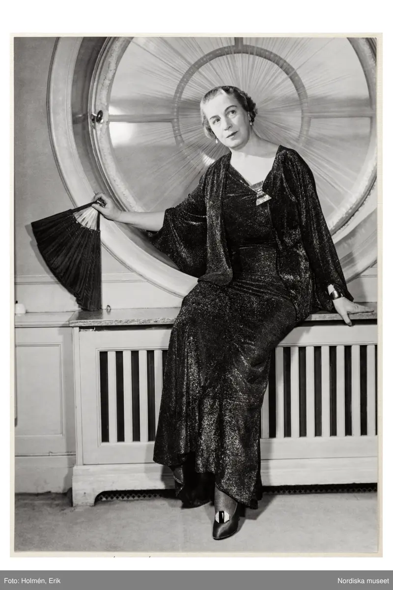 Pauline Brunius poserar på NK:s Franska damskrädderi iklädd hellång klänning med jacka över, båda i glittrande tyg. Vid dekolletaget en brosch, pumps med spänne. I handen håller hon en solfjäder.