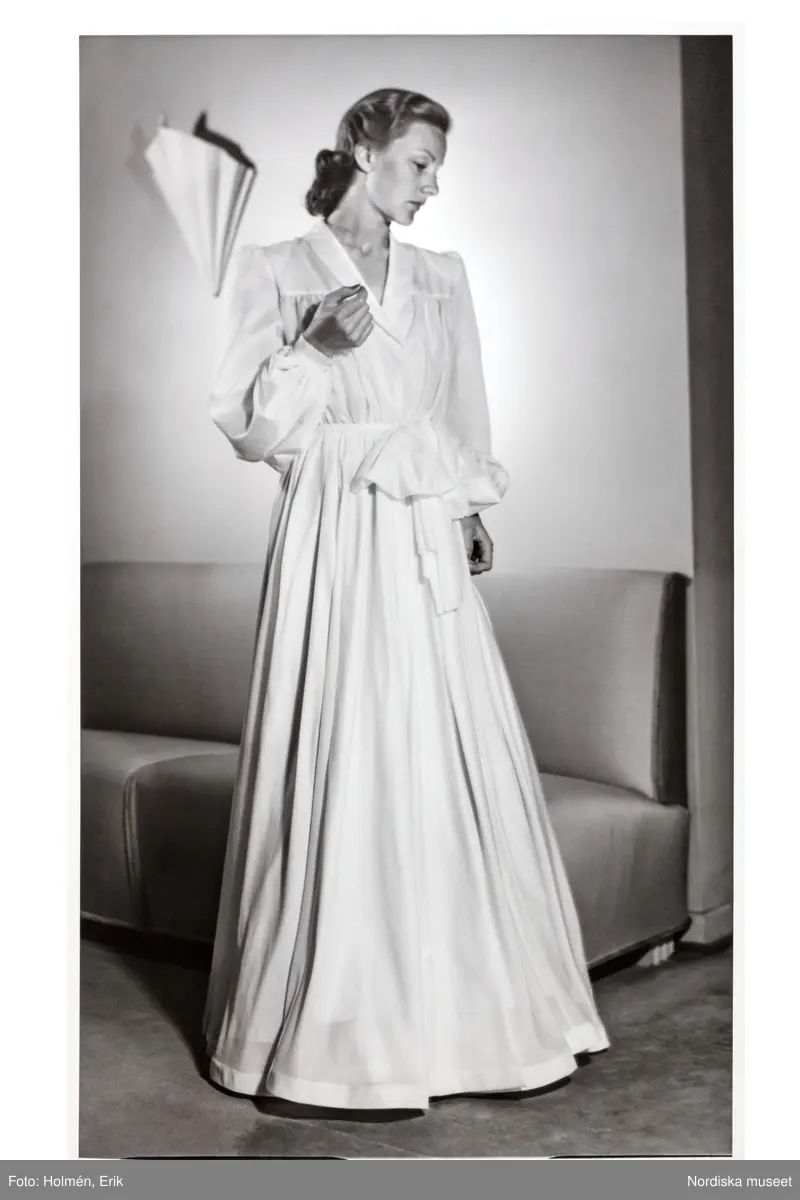 En mannekäng poserar i provrummet på NK:s Franska damskrädderi. Hon är iklädd en hellång dressinggown (morgonrock) med stor rosett i midjan. Plagget av siden är sytt av en engelsk fallskärm.