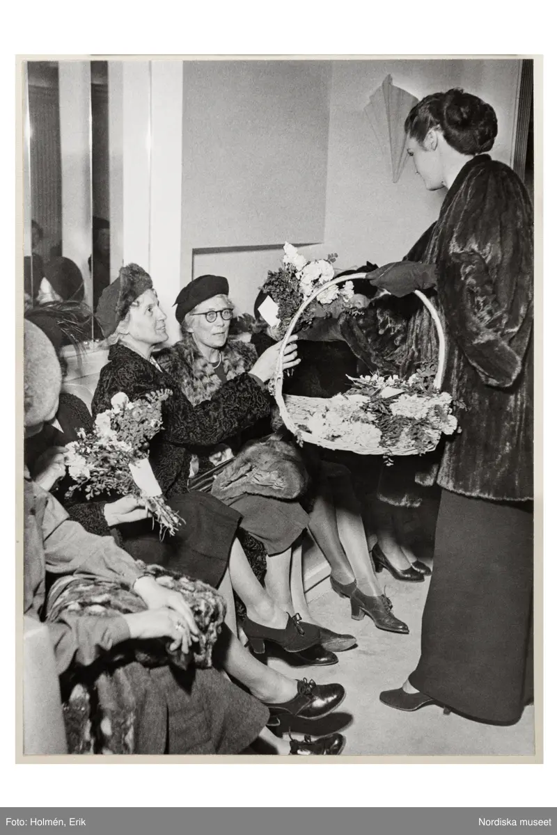 Modevisning på NK:s Franska damskrädderi. Mannekäng visar hellång klänning med pälsjacka över. Håret uppsatt i elegant knut. I handen en korg med blommor, nejlikor från Côte d'Azur, som hon delar ut till några av de presumtiva kunderna som sitter i rummet, mest medelålders kvinnor.