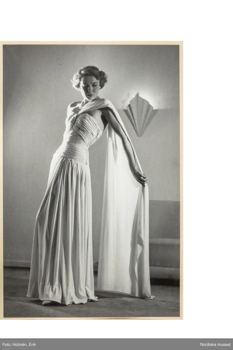 Mannekäng visar festplagg i provrummet. Hellång aftonklänning med figurnära, draperat liv. Från dekolletaget löper en sjal över axeln och faller ned över ryggen. Från höften rynkad kjol. NK:s Franska damskrädderi.