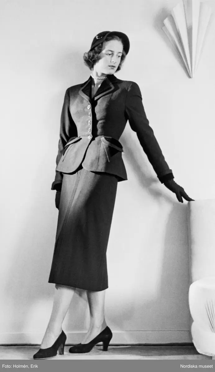 Mannekäng visar plagg i provrummet. Dräkt med figursydd stusslång jacka. Avvikande tyg på krage, ficklock och manschett, knäppning fram. Vadlång, rak kjol. Hatt och pumps med medelhög klack. NK:s Franska damskrädderi.