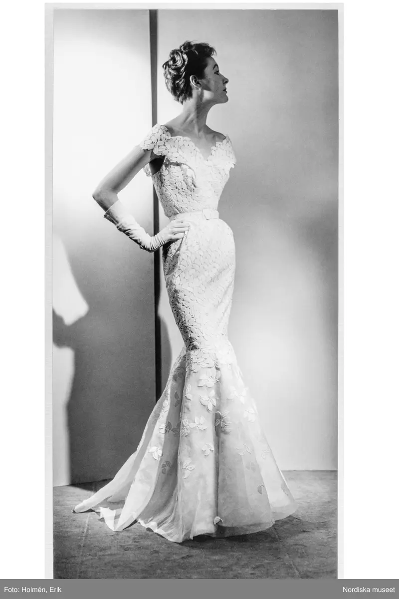 Mannekäng visar festplagg i provrummet vid NK:s Franska damskrädderi. Hellång aftonklänning av spetstyg med blommönster i relief, kortärmad med skärp i midjan. Kjolen åtsittande över höft och lår. Från knäet vidd i avvikande transparent tyg med spridda blad. Glacéhandskar.