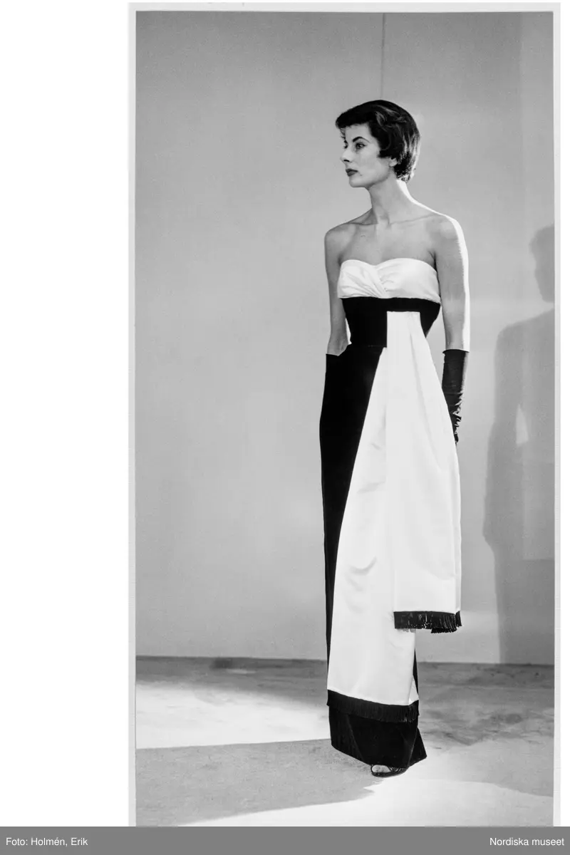 Mannekäng visar festplagg i provrummet vid NK:s Franska damskrädderi. Tvåfärgad aftonklänning med bara axlar, rynkning vid dekolletaget, figurnära liv, hellång, rak kjol. Nedanför bysten är en lång sjal med fransar fäst. Glacéhandskar.
