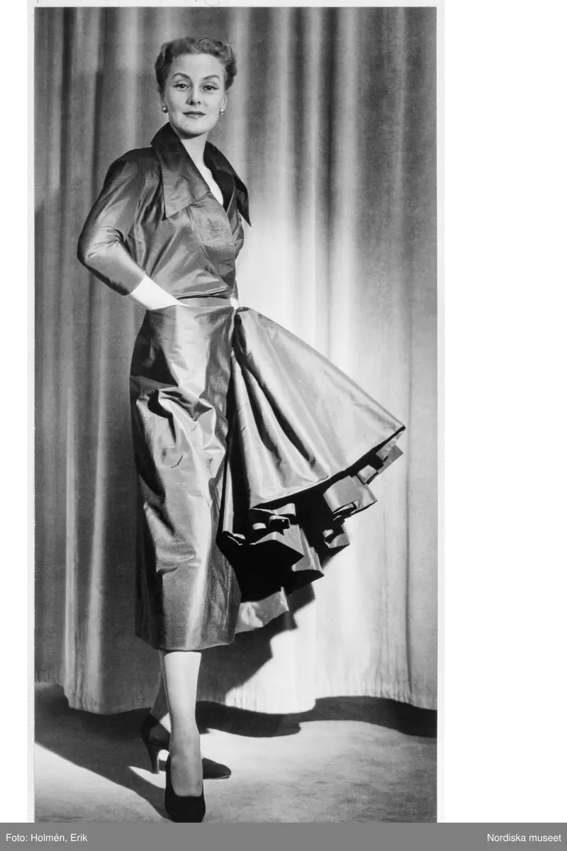 Mannekäng poserar i festplagg framför draperi i provrum vid NK:s Franska damskrädderi. Klänning av sidentyg, liv med omlottskärning och krage med stora snibbar, trekvartslång ärm. Vadlång kjol med drapering vid ena höften. Pumps med hög klack.