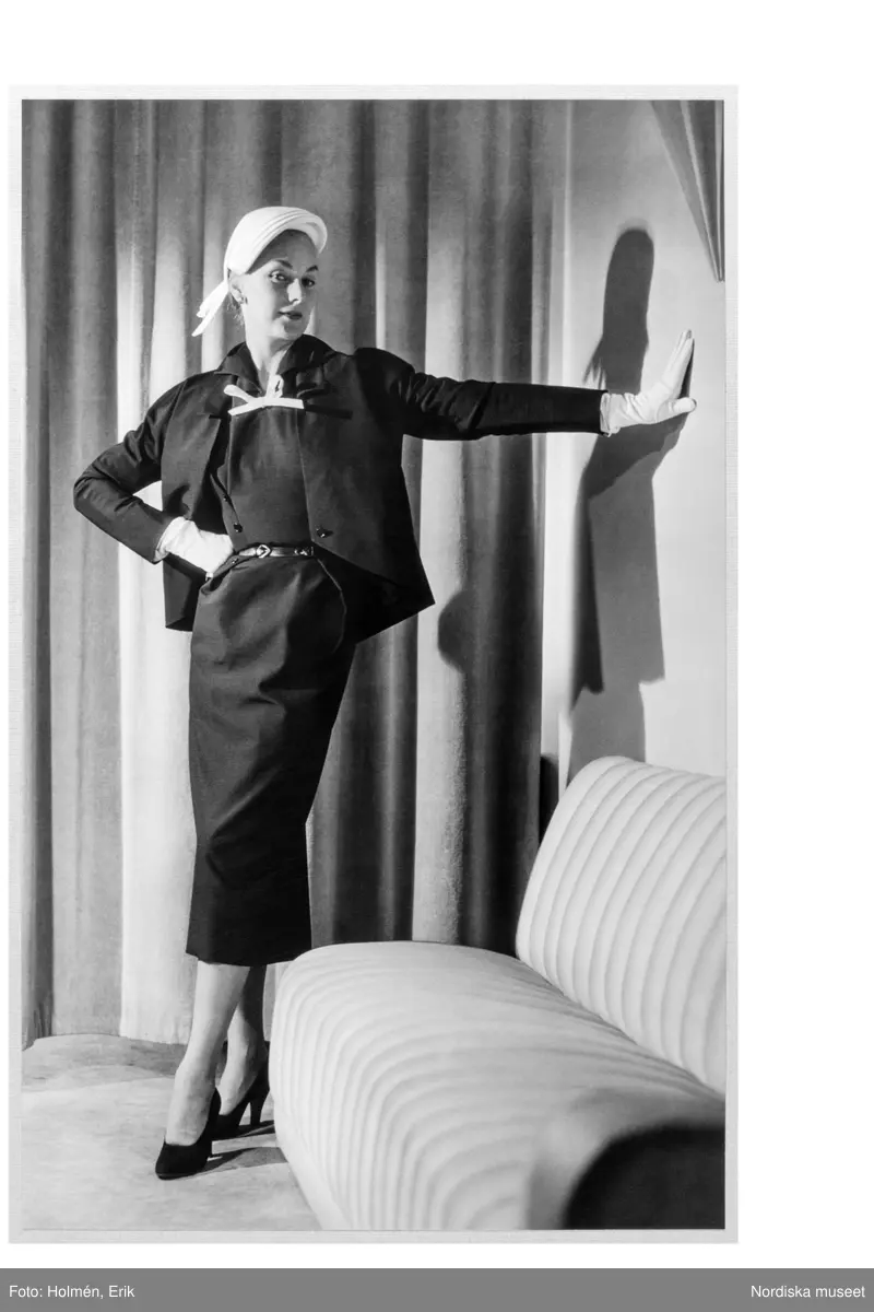 Mannekäng poserar framför draperi i provrum vid NK:s Franska damskrädderi. Klänning med liv knäppt i sidan, liten krage med rosett i avvikande färg, bälte i midjan och vadlång pennkjol. Över bär hon en höftlång jacka. Hatt, handskar och pumps med hög klack.