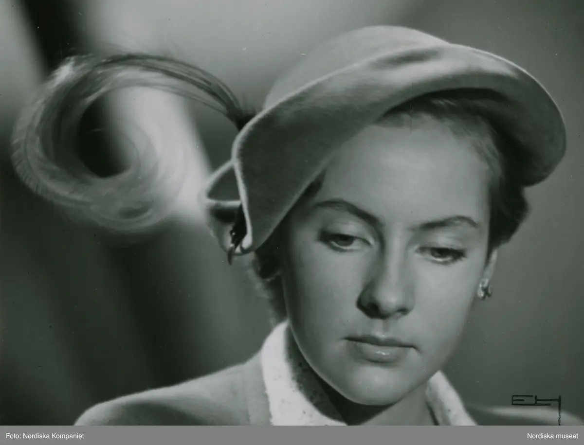 Porträtt av modell i hatt med fjäderdekoration, örhänge och vit blus.