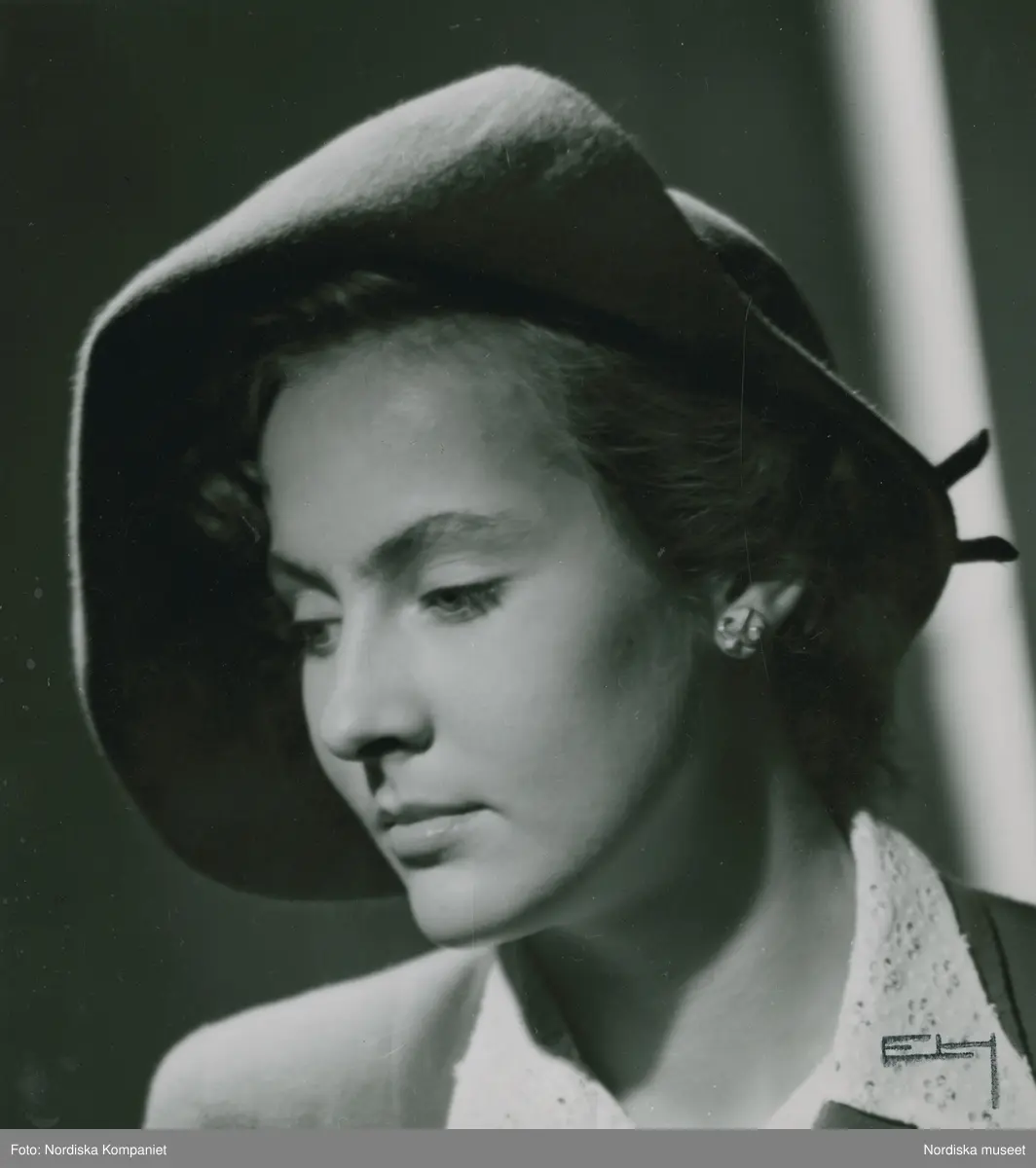 Porträtt av modell i hatt med uppsvängt brätte och örhänge, vit blus.