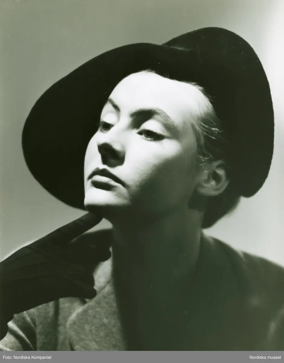 Porträtt av modell i svart sammetshatt och handskar. Av Legroux Soeurs.