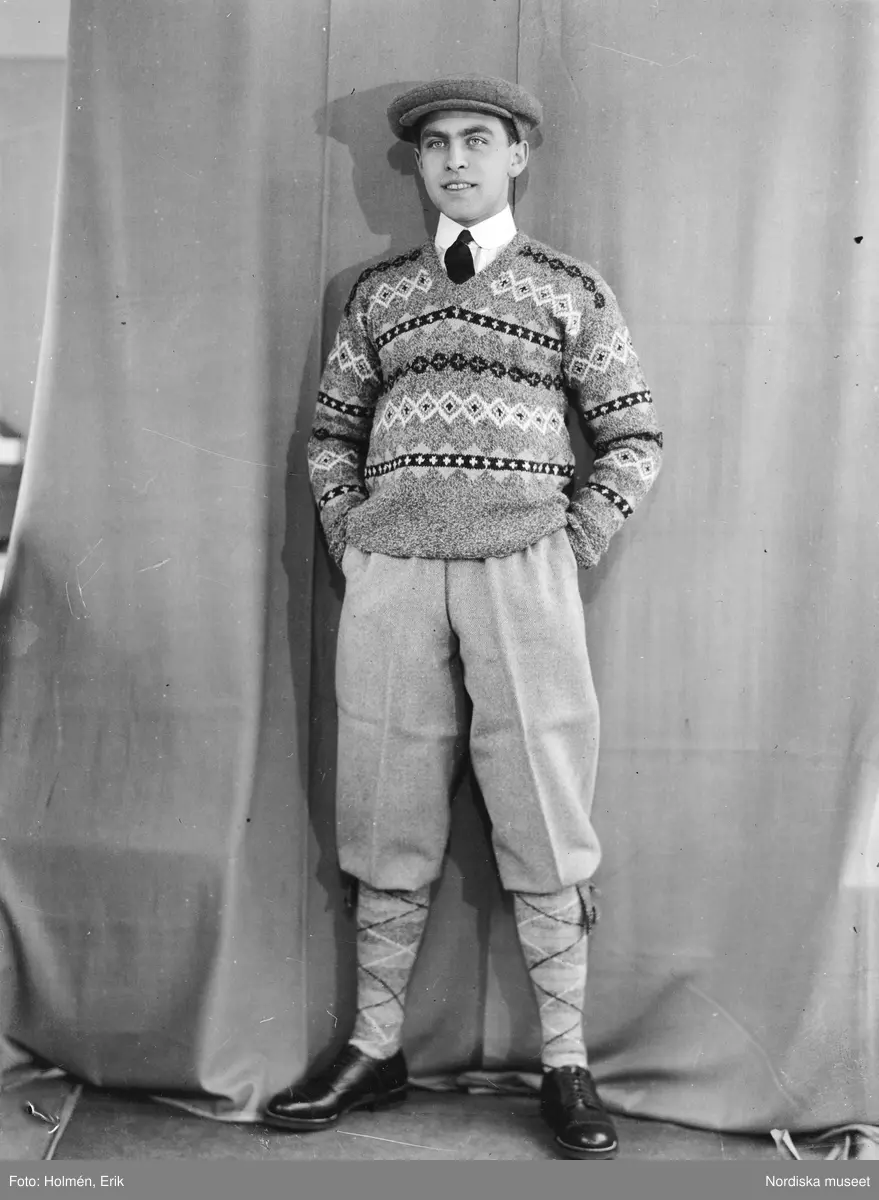 Ung man i mönstrad tröja, äppelknyckarbyxor/golfbyxor, knästrumpor och keps.