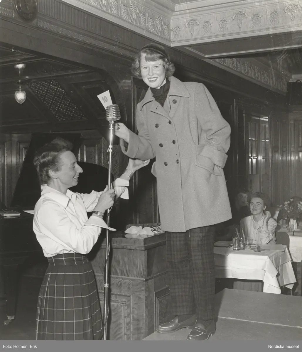 Nordiska Kompaniet. Tonårsmode 1950. Flicka i ljus jacka modell skepparkavaj. Rutiga byxor. T v en kvinna i vit blus och rutig kjol med en mikrofon. I bakgrunden modepublik vid dukade kaffebord. Text på baksidan: "Första tonårsvisningen för inbjudna. Hösten 1950"
