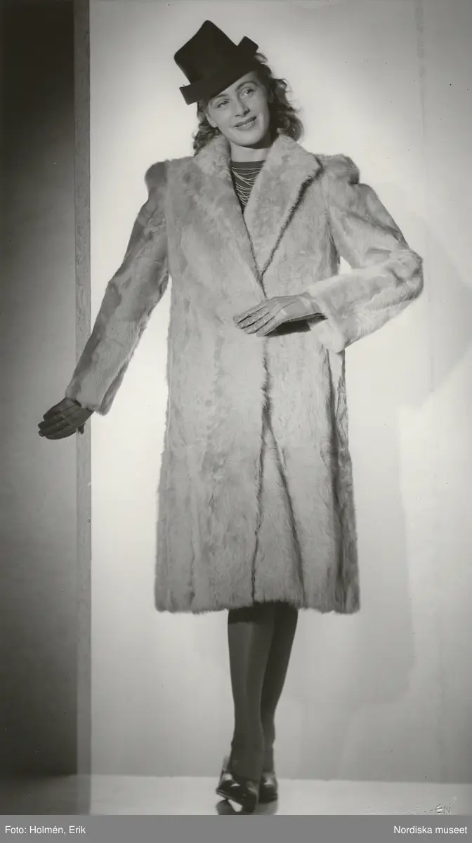 Nordiska Kompaniet. Kvinna i ljus päls, ljusa handskar och mörk hatt med brätte.
