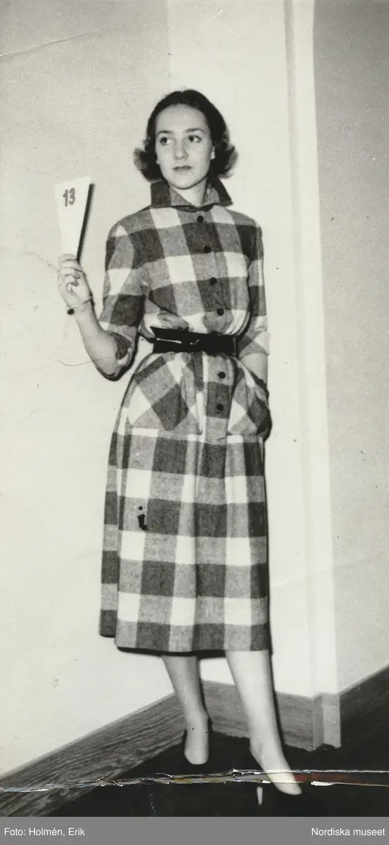 Nordiska Kompaniet. Tonårsmode 1950. Flicka i högt knäppt, storrutig klänning med armbågslång ärm och diagonalställt parti över höften. Midjan markerad med mörkt skärp. Text på baksidan: "grårutig tonårsklänning 1950. helylle. pris 105:- Tonåringarnas betyg: a+ för modellen, a för färgen, Ba för priset. Mödrrnas betyg: A för modellen, A för färgen, AB för priset."