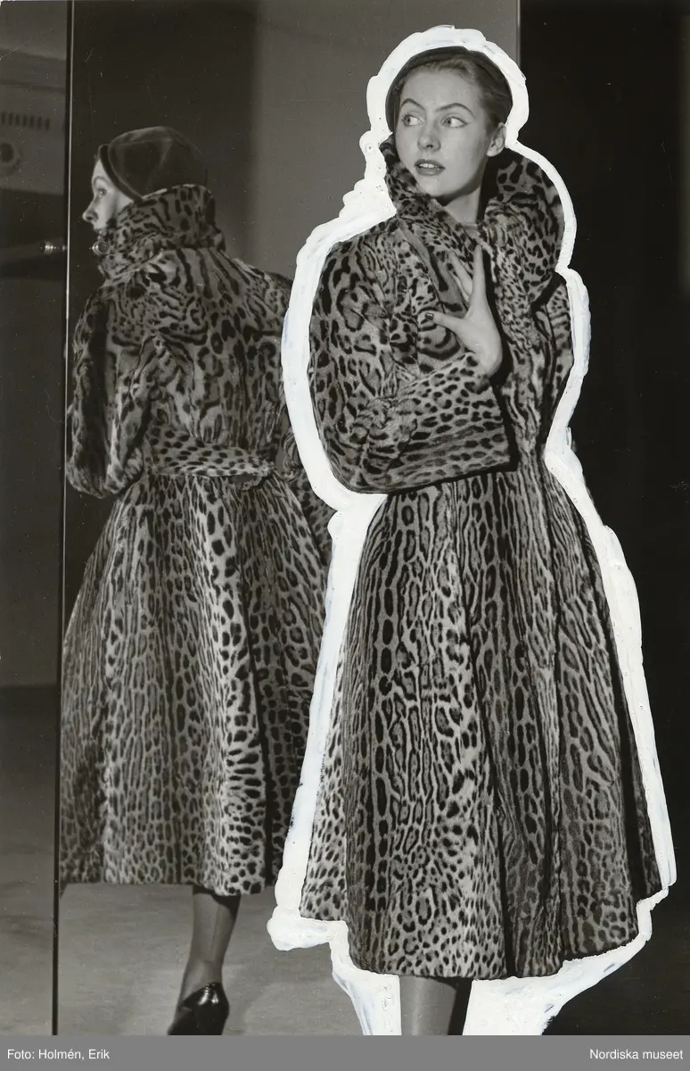 Nordiska Kompaniet. Kvinna i ozelotpäls med rundad krage och skärp. Text på baksidan:"nov. 1950"