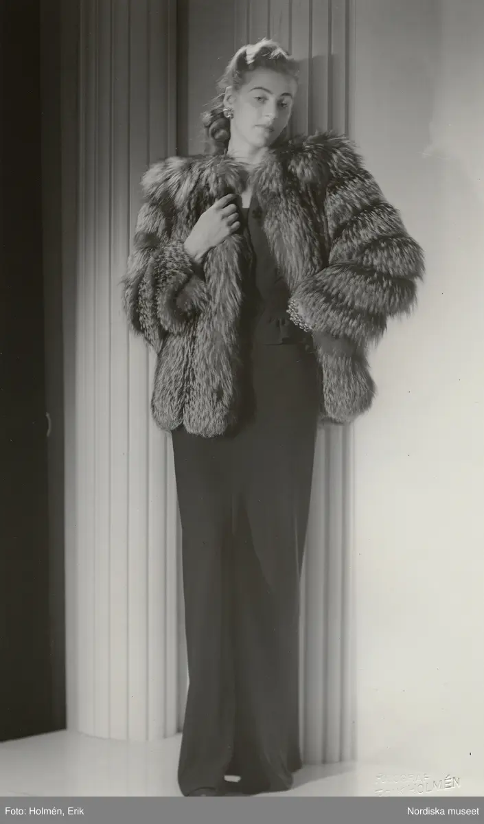 Nordiska Kompaniet. Kvinna i aftonklänning och höftlång pälsjacka.