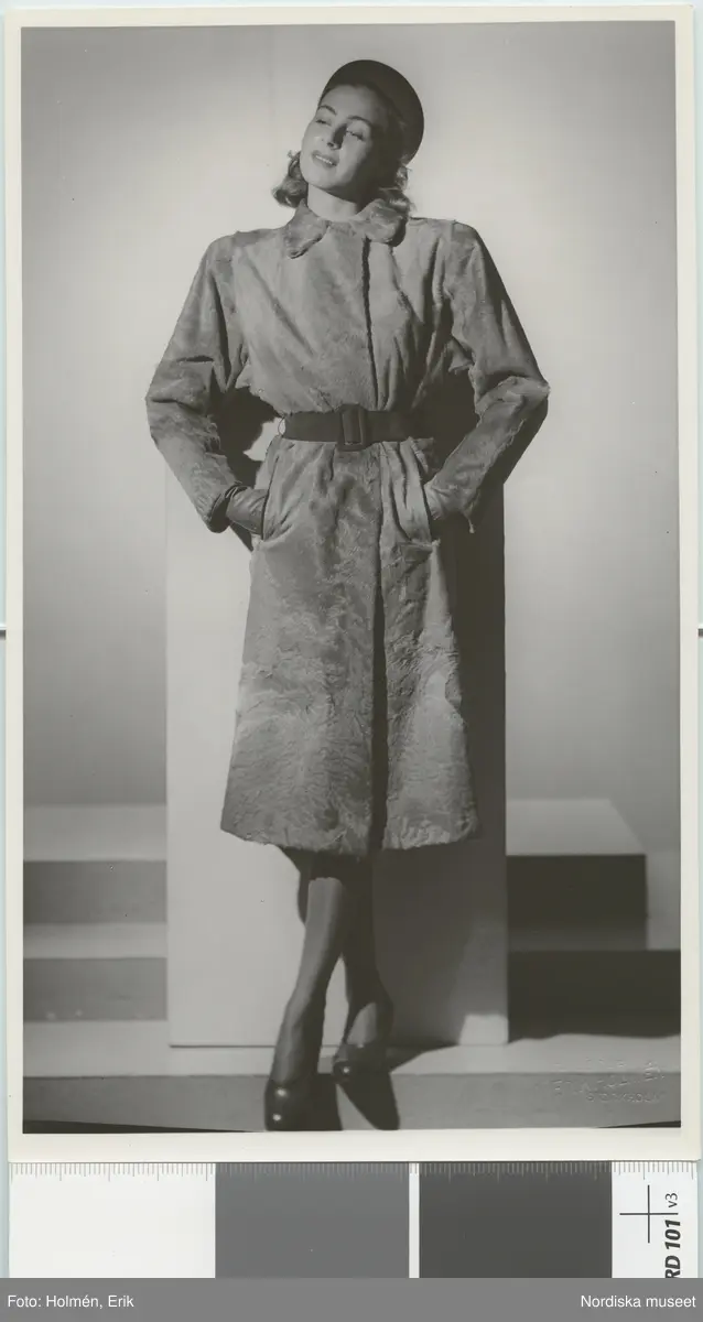 Nordiska Kompaniet. Kvinna i ljus päls och svart skärp. Text på baksidan: "Arkivbild d. 21/8 45"