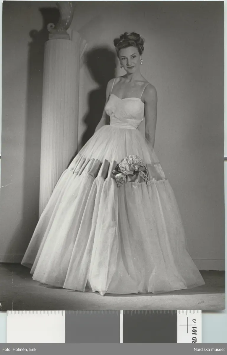 Nordiska Kompaniet. Kvinna i ljus aftonklänning med tunna axelband. Blankt band med blombukett runtom kjolen.