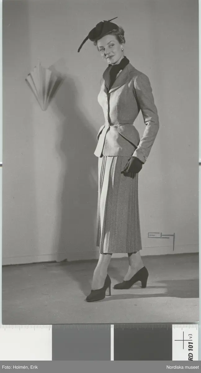 Nordiska Kompaniet. Kvinna i ljus, mönstrad, vadlång dräkt med starkt insvängd midja. Mörka handskar, mörk halsduk samt mörk hatt med fjäder. Text på baksidan: "Molyneux"