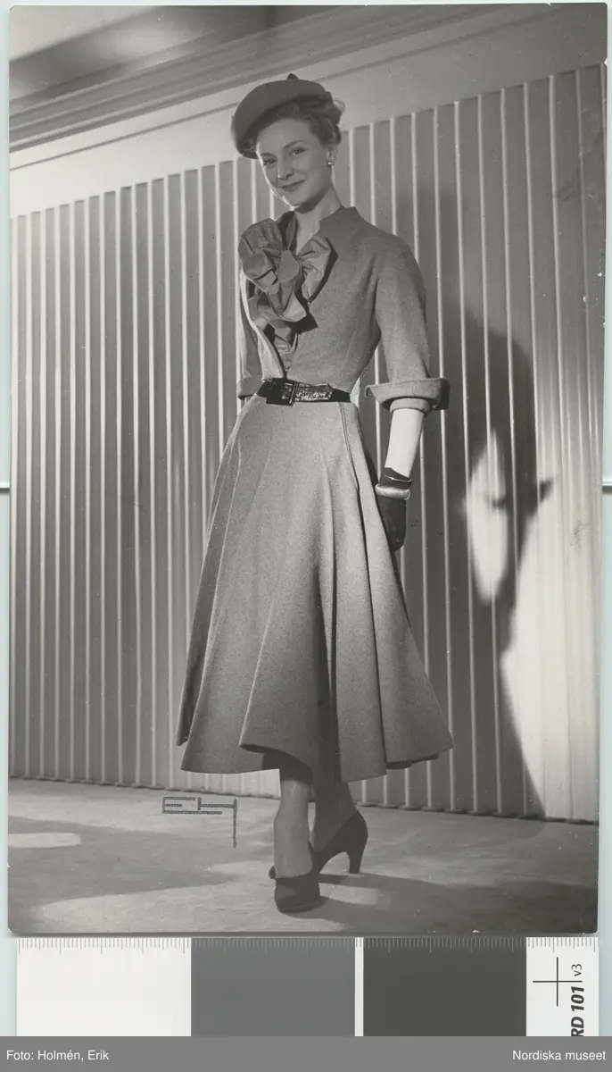 Nordiska Kompaniet. Kvinna i klockad klänning, trekvartsärm med uppvik. Blus med krås, svart skärp och svarat handskar. Text på baksidan: "Christian Dior new look".