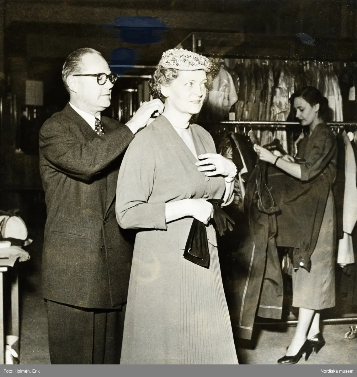 Man i mörk kostym knäpper ett vitt pärlhalsband på fru Klarenius i samband med konfektionsvisning för personalen på Nordiska Kompaniet. Fru Klarenius klädd i klänning med plissering framtill, hatt med flor, örhängen, armband och ring. Håller ett par svarta handskar i handen. I bakgrunden skymtar en kvinna klädd i mörk klänning och svarta pumps. Kvinnan hänger upp kläder på en klädhäst.