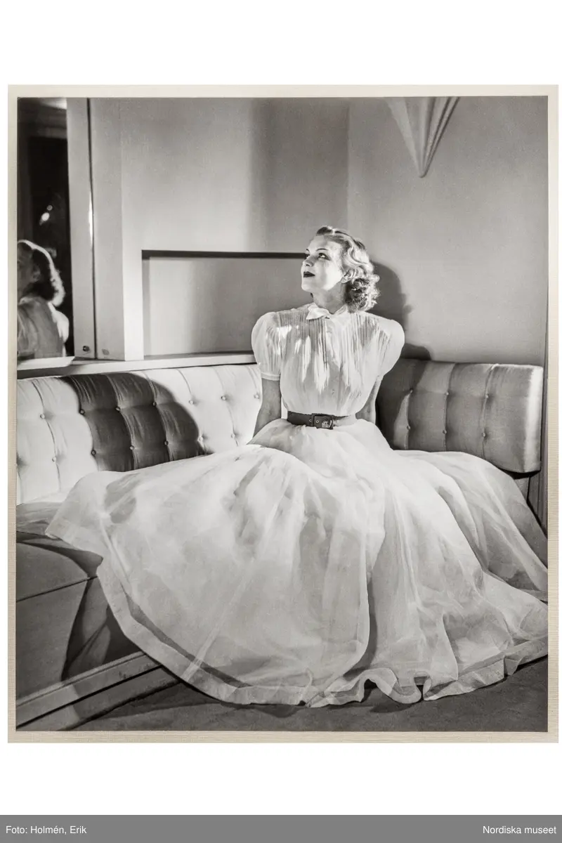 Mannekängen Margit Langlet visar plagg sittande i soffa i provrum med klassicistisk dekor. Klänning med blusliv, liten krage och rosett i halsen samt kort puffärm. Skärp i midjan, hellång, vid kjol med övre lager av tyll. NK:s Franska damskrädderi.