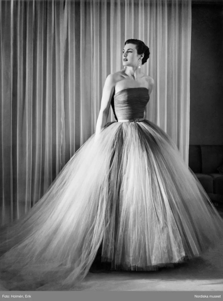 Mannekäng visar festplagg framför draperi. Aftonklänning med axlarna bara. Figurnära liv och vid, hellång kjol med flera lager av tyll, det översta utgör litet släp. Midjan markerad med smalt skärp. Långa örhängen med pärla. Klänningen består av 99 meter tyll i olika nyanser av grått med orangeröda inslag nedtill, NK:s Franska damskrädderi, från Jacques Griffe.