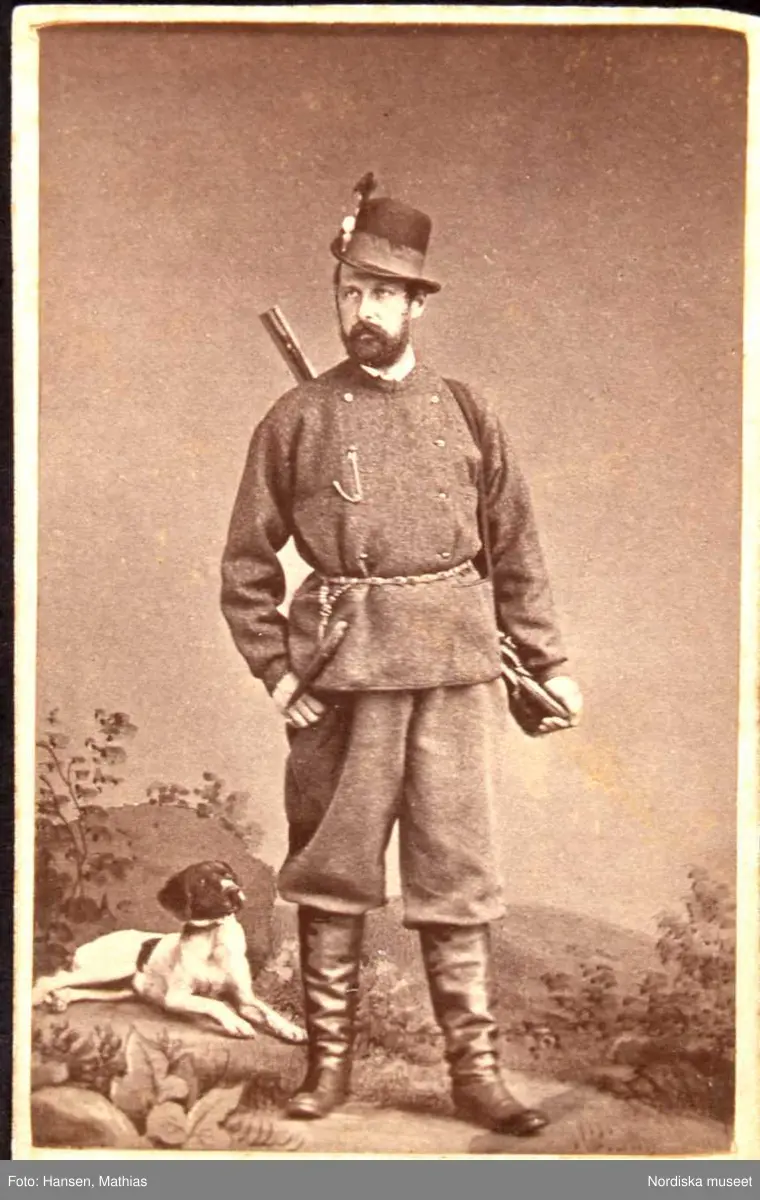 Jägare med hund. Ateljéporträtt.