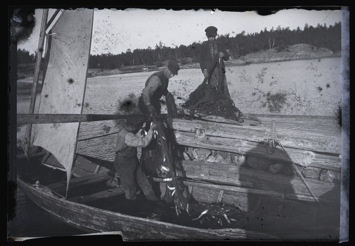 Tre fiskare vittjar nät på sin fångst vid kajen.