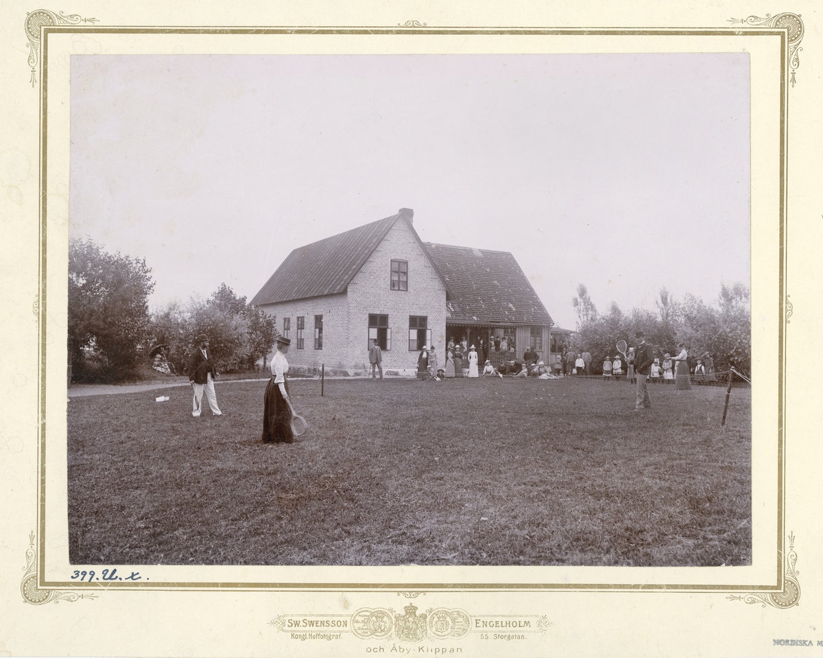 Ett sällskap med både kvinnor och män i sommarkläder framför en byggnad. Några spelar tennis, dubbel, medan andra är åskådare.