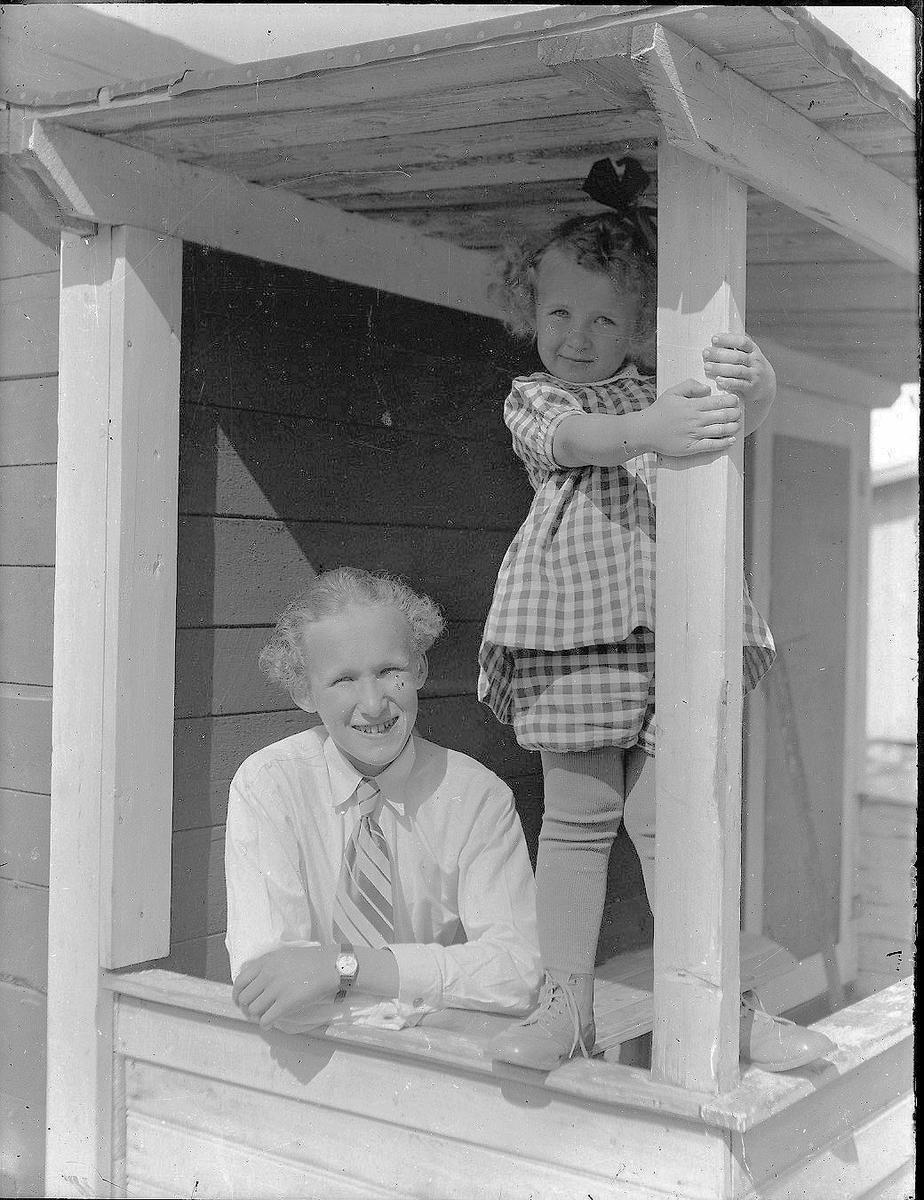En pojke och en liten flicka tittar från en veranda. Lima, Dalarna.