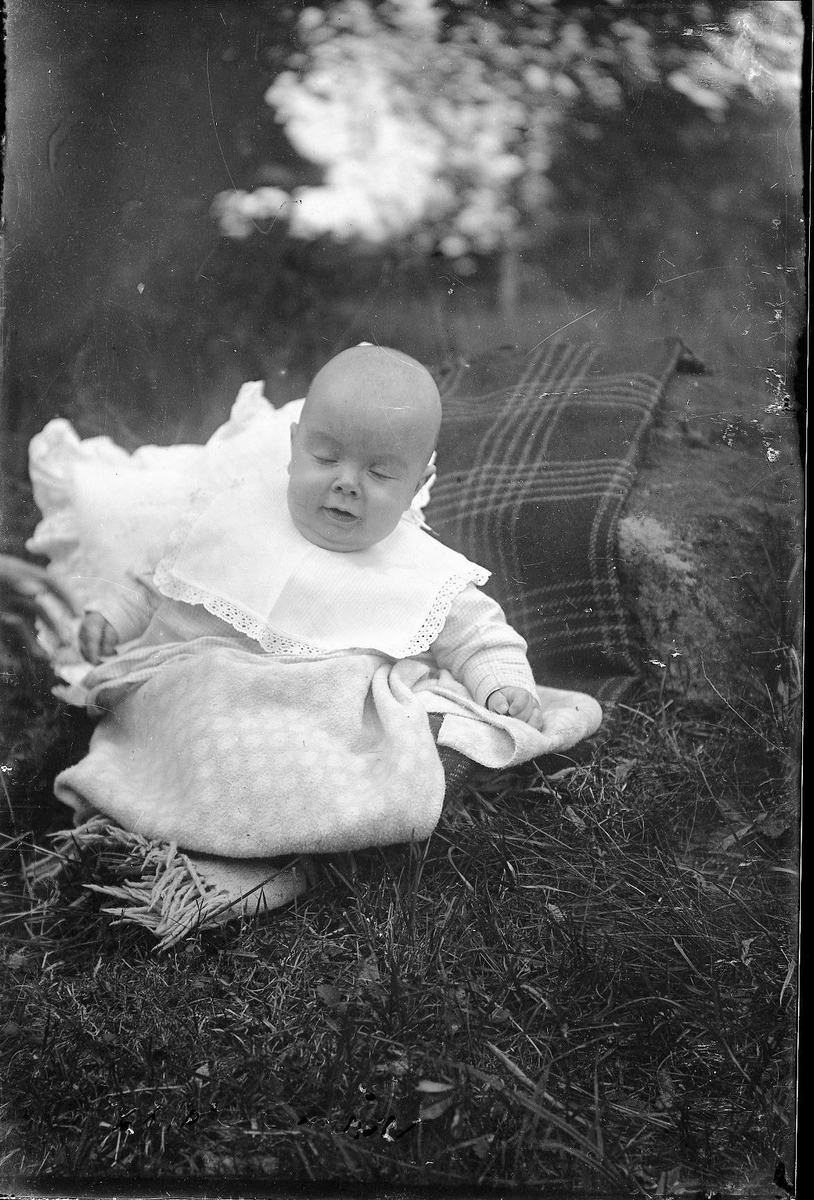 Ett spädbarn sitter i det gröna. Lima, Dalarna.