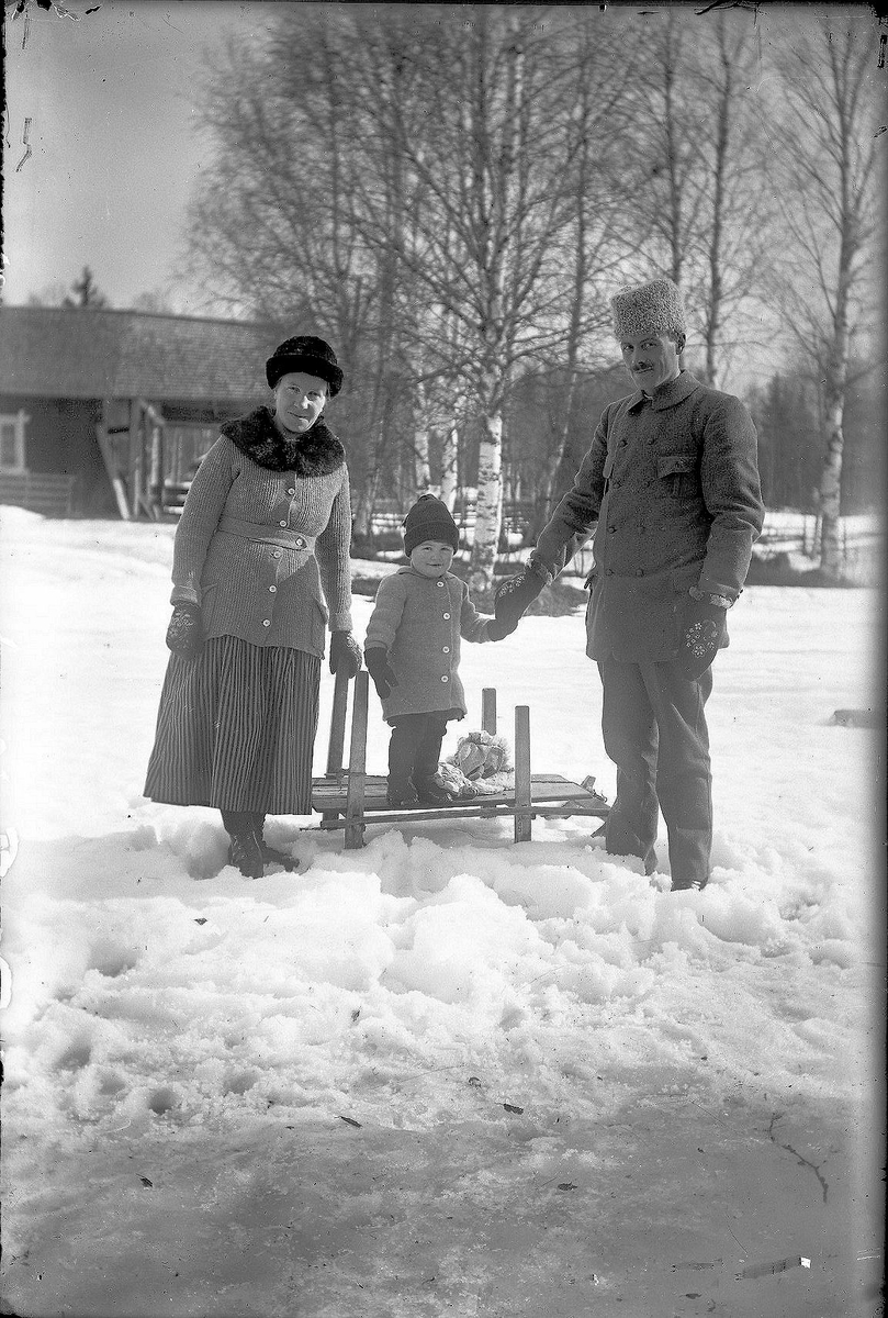 Porträtt av en barnfamilj med kälke i vinterlandskap. Lima, Dalarna.