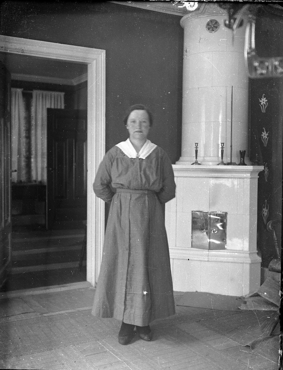 Helporträtt av en kvinna i rumsinteriör med kakelugn i bakgrunden. Lima, Dalarna.