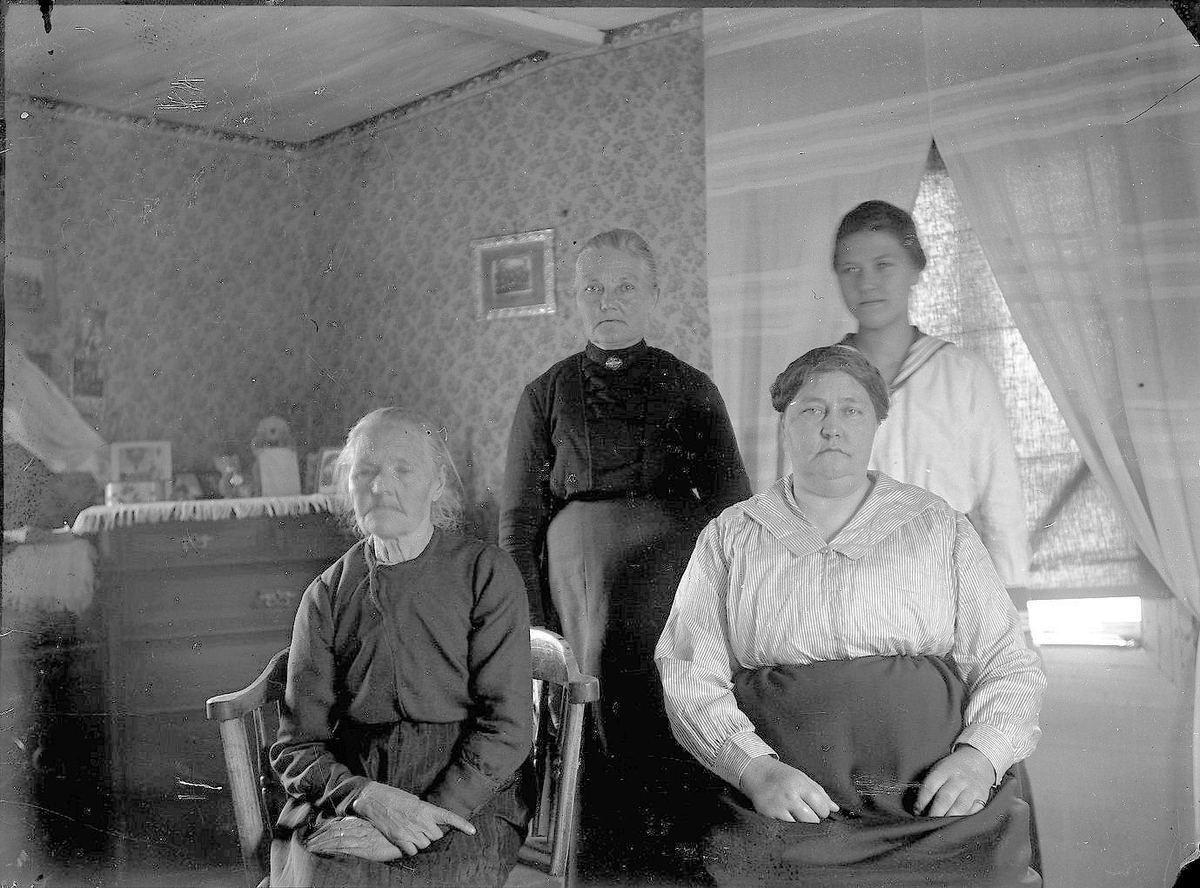 Gruppbild av fyra kvinnor i interiör. Lima, Dalarna.