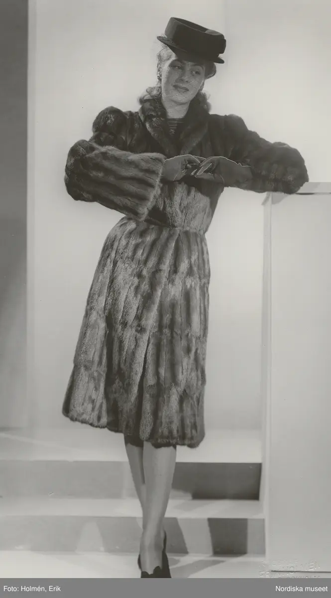 Nordiska Kompaniet. Kvinna i päls med markerad midja. Mörk hatt med brätte och flor. Mörka handskar.