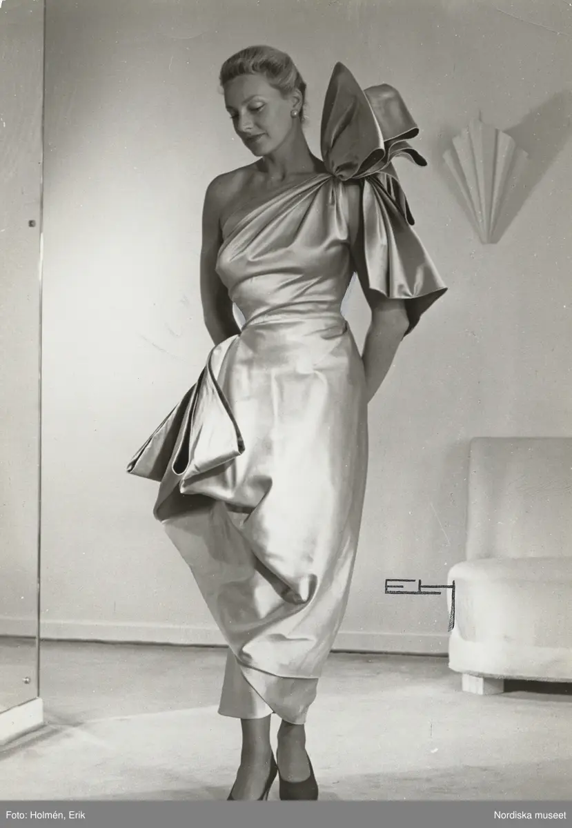 Nordiska Kompaniet. Kvinna i ljus sidenklänning med ena axeln bar. Den andra med ett stort arrangemang med rosett. Text på baksidan: "Jaques Griffe Hösten 1949".