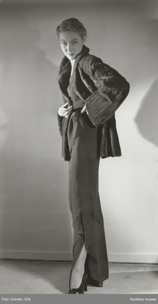 Nordiska Kompaniet. Kvinna i mörk, slitsad aftonklänning och mörk pälsjacka. Text på baksidan: "Brunfärgad hermelin. NK Nov. 1950"